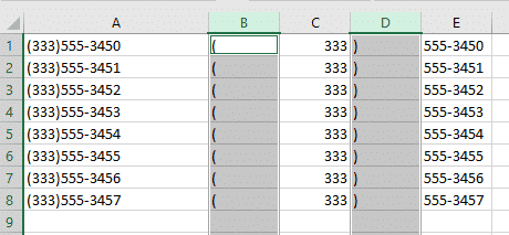 A more common situation is separating a phone area code in brackets from the main number. For example (303)555-1234 into columns for area code and number.