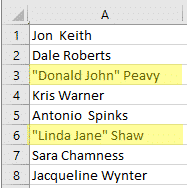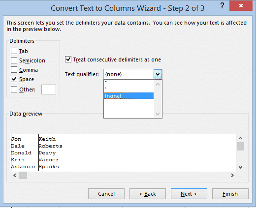 This is used if your data contains instances of the delimiter character within the text itself, that needs to be treated as regular text and not as a place to split the data. For example, with our name data, if some of the people had middle names, and we didn’t want a separate middle name column, but just wanted these to go in the Given Name column with the first name, we would need to enclose both of the given names in the qualifier character, which tells Excel to ignore any spaces within that data.