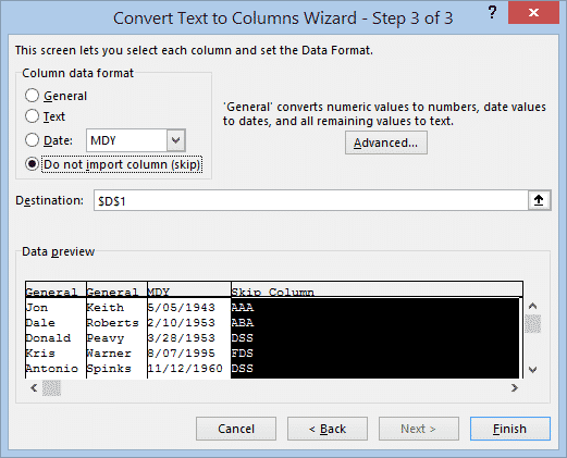 The official choice is ‘Do not import (skip)’ which is great if you’re absolutely sure the Text to Columns split works 100% of the time. In other words that the data is consistent.