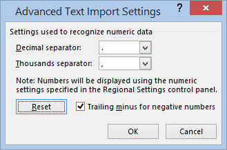 The Advanced button on the third page of the wizard contains settings for how to recognize numeric values in the source data – whether decimals and thousands are indicated by a comma or a dot, and whether a dash after a number should be regarded as a negative number.