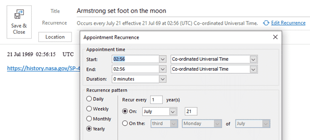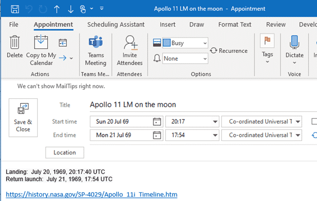Here’s a practical example of how to share an appointment or event with reminders using the iCalendar .ics standard. Some Apollo 11 events ready to download and add to your calendar (in Outlook or other software).