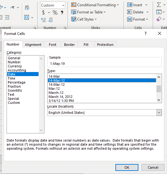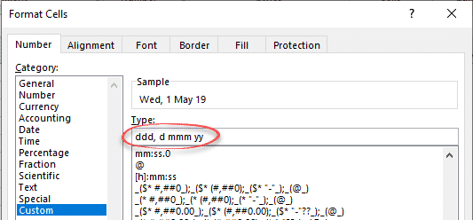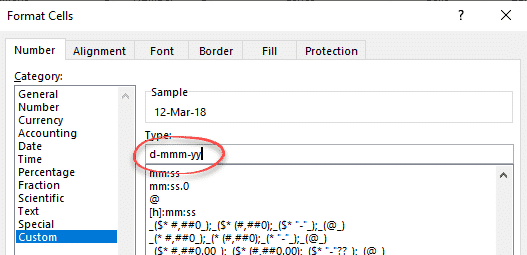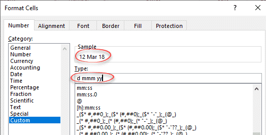 For example, we’d like the format  1 Mar 19 – day with no leading zero ( d ) , month as three letters ( mmm ) and two-digit year ( yy ).