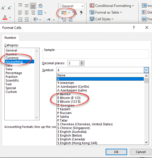 Excel has a new currency option. Bitcoin BTC is now available as a Currency symbol or text from the main list but we’ll show how to get it now on any version of Excel.