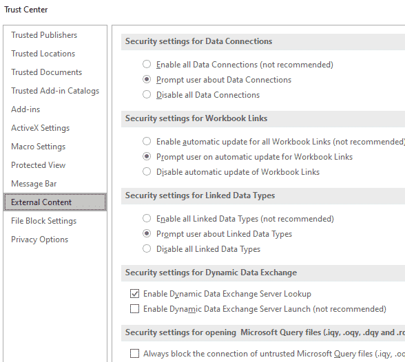 While DDE is old, it’s still in use, so in January 2018, Microsoft added some more Excel DDE options. To allow users and administrators permit DDE in some situations but close off most DDE access.