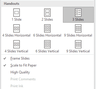 Under File | Print is the basic handouts option to print slides and lines for people to handwrite notes.