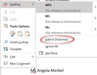 Removing the existing word from the dictionary is also possible so the terms like ‘Ms.’ get a red squiggle.