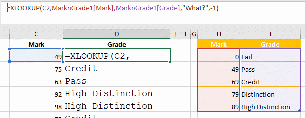 Then use either Vlookup() or Xlookup() to lookup marks and return a grade.
