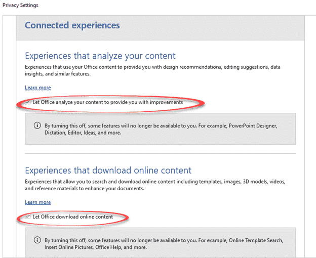 All these cloud connections send information to Microsoft. The company groups these services into ‘download’ and ‘analyze’ customer data but the reality is that all the ‘Connected Experiences’ send some of your personal or business data to Microsoft.  Any of that data can be used by Microsoft or shared with other agencies without notice or explicit consent.