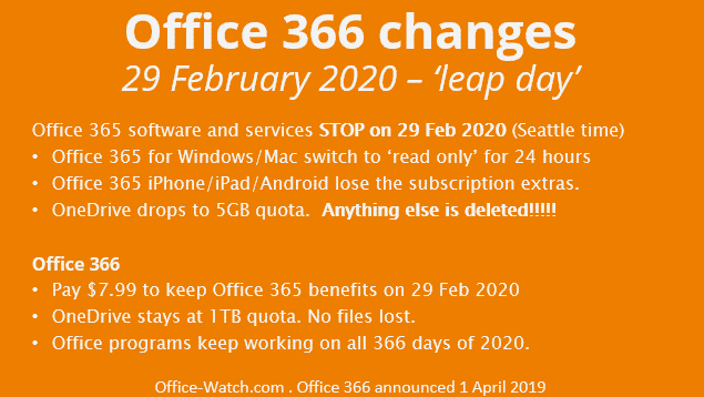 On 29 Feb 2020, most of your OneDrive docs, picture and files will go ‘poof’ into the ether.  Deleted, erased, wiped, removed, put in a dead parrot cage and gone to join the choir invisible.