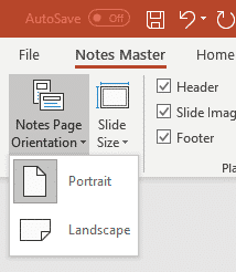 The first tab on the Notes Master ribbon is the Page Setup options. Here you can choose: