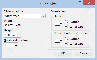 - Slide Size – the standard options here are standard or widescreen, but you can also choose to set a custom slide size.