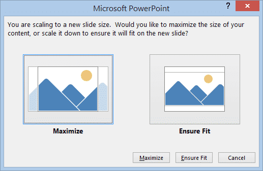 When you choose standard or custom slide size, it is possible that some of your slide content may not fit within the new size, so you are asked what you want to do if it doesn’t fit. You can maximize the content (some parts on the sides may get cut off) or ensure fit (the content will be a little smaller, but all will be visible).