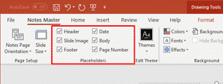 Click in each of the placeholder fields to add or edit content. There is a lot of flexibility in what you can add here – you can go to the Home tab or Format tab to change fonts or paragraph styles, add text effects, shapes, or format the placeholder box itself. Click back onto the Notes Master tab when you have finished your formatting. This is particularly useful for formatting the appearance of your notes themselves, which you can do with quite a bit of detail in the Body placeholder box.