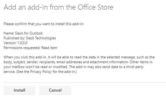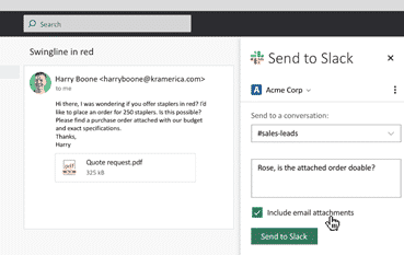 Slack has an app in the Microsoft Office plugin store which works with Outlook mail stores hosted by Microsoft or a recent release of Exchange Server 2016.