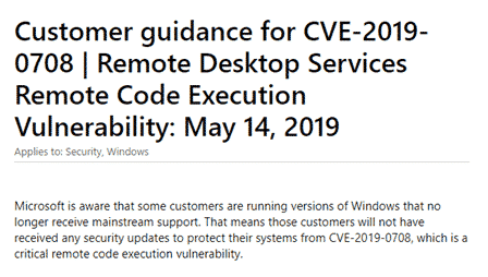 Those links are according to Microsoft though the KB articles for those patches make no mention of Bluekeep, CVE-2019-0708 or even the Remote Desktop Protocol! That might seem strange but it’s typical of Microsoft’s poor public documentation of security updates.