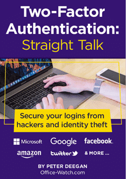 Office Watch has released an ebook all about Two-Factor Authentication: Straight Talk. It explains, step-by-step, how to setup ‘2Fac’ for all major accounts (Microsoft, Apple, Google, Facebook etc). The book also busts some common misunderstandings which stop people using two-factor authentication.