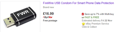 Intrigued we looked on Ebay for ‘USB condom’ and discovered there are TWO types of USB condom.