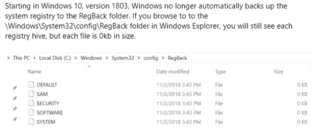 That’s all great and a good precaution. So naturally Microsoft dropped auto backups of the Registry in March 2018 AND didn’t tell customers they’d done it.