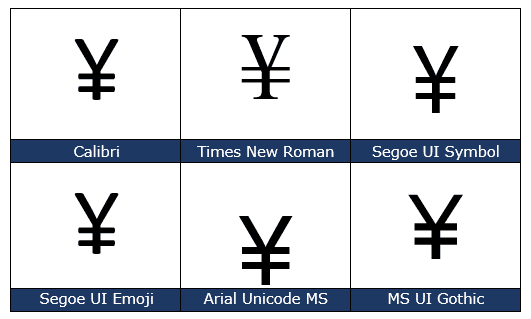 Here’s some examples of how Yen ¥ looks in common Office fonts.
