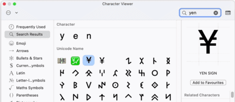Or Command + Control + Spacebar shortcut to open the Character Viewer. Search for ” Yen ” and the Viewer should find the symbol you need.