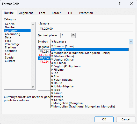 If the currency or symbol isn’t there, go to Format Cells | Currency or Accounting where there’s a long, long list of currency symbols including six Yen options.