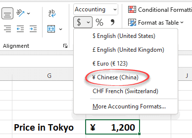 To display a cell value as Yen, use the Currency or Accounting cell formats then choose the currency symbol from the drop-down menu.