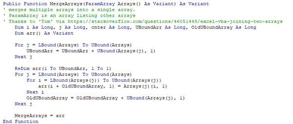 Public Function MergeArrays(ParamArray Arrays() As Variant) As Variant ' merges multiple arrays into a single array. ' ParamArray is an array listing other arrays ' Thanks to 'Tom' via https://stackoverflow.com/questions/46051448/excel-vba-joining-two-arrays Dim i As Long, j As Long, cnter As Long, UBoundArr As Long, OldUBoundArray As Long Dim arr() As Variant For j = LBound(Arrays) To UBound(Arrays) UBoundArr = UBoundArr + UBound(Arrays(j), 1) Next j ReDim arr(1 To UBoundArr, 1 To 1) For j = LBound(Arrays) To UBound(Arrays) For i = LBound(Arrays(j)) To UBound(Arrays(j)) arr(i + OldUBoundArray, 1) = Arrays(j)(i, 1) Next i OldUBoundArray = OldUBoundArray + UBound(Arrays(j), 1) Next j MergeArrays = arr End Function