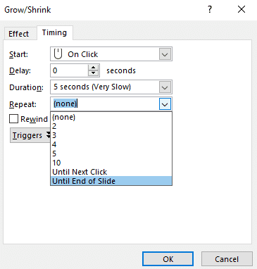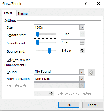 If you’d like a little pause between each Grow/Shrink animation, Effects Options | Timing | Delay lets you choose a n seconds break.
