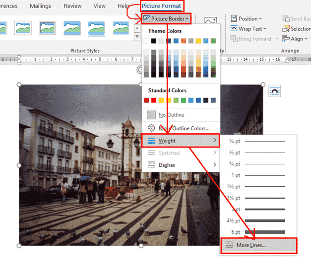 To get to the compound borders, click on the picture and go to Picture Format | Picture Border | Weight | More Lines.