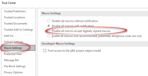 In Office, some security settings allow digitally signed documents or code to be run without prompting. Trust Center | Macro Settings has an option to run digitally signed code without warning. Happily, it’s not the default setting (that’s Disable all macros with notification).