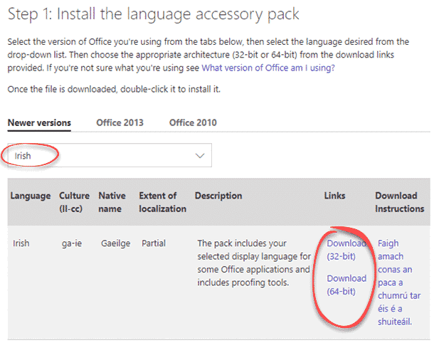 To set as a proofing language go to Office site Language Accessory Pack for Office choose Irish then download the right version (32-bit or 64-bit) See Which Office do I have 32-bit or 64-bit?