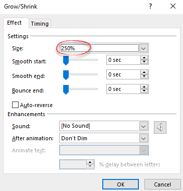 Now adjust the amount or depth of zoom. Go to Grow/Shrink, Effect Options | Effect | Size.