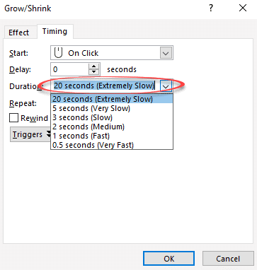 Once you’re happy with the zoom in and motion path, extend the timings of both effects to something slower. In each Animation Pane item, go to Timing | Duration. Maybe start with 20 seconds (Extremely Slow) and adjust from there.