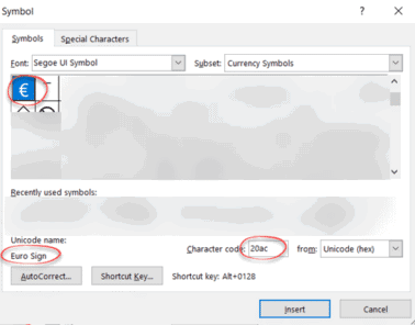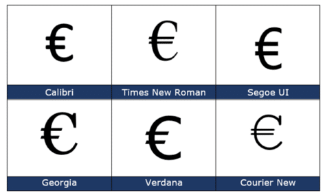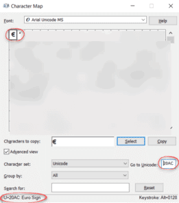 - Search for “ Euro “ and the Viewer will find the symbol you need.