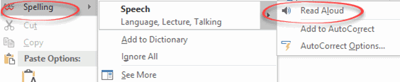 One of the extended spell check right-click options is ‘Read Aloud’ to speak the suggested word.