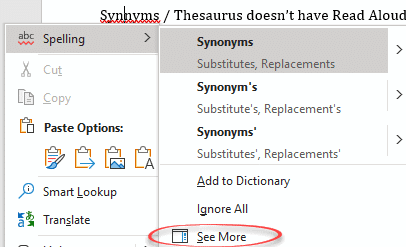 Synonyms / Thesaurus does not have Read Aloud options either on the fly-out menu or the Thesaurus pane.