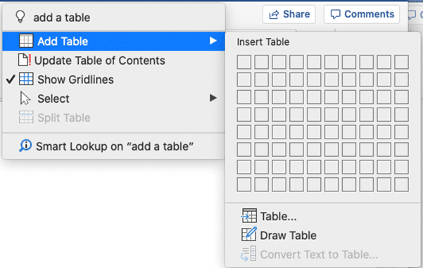 Type in a phrase and Office will show relevant (hopefully) features. Not just help but the actual buttons or menu items. Click on the Tell me result to do that action. In this case ask ‘add a table’ and the Add Table command appears with the flyout to set the rows & columns.