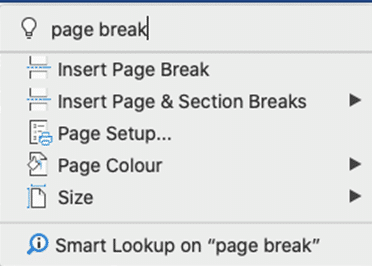Search for ‘Page Break’ and the correct option appears but no tip that Ctrl + Enter will do the job much faster.