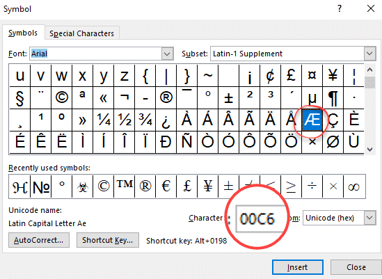 Æ shortcuts in Word
