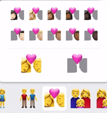 The couples emojis have many variations – Man & Woman, Two Women, Two Men plus a gender neutral option. And finally, various skin tone options to choose from. Skin tone options shown in the iOS emoji panel.
