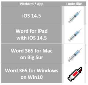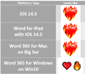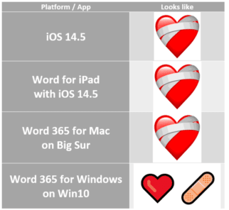 Emoji look different on different platforms. In this case, Word for Windows can’t cope properly with many of the new iOS 14.5 emoji, as you’ll see in the examples below. The new couples emoji don’t display properly even in Word for iPad or Mac, which is surprising since the emoji changes have been available to iOS testers for months.