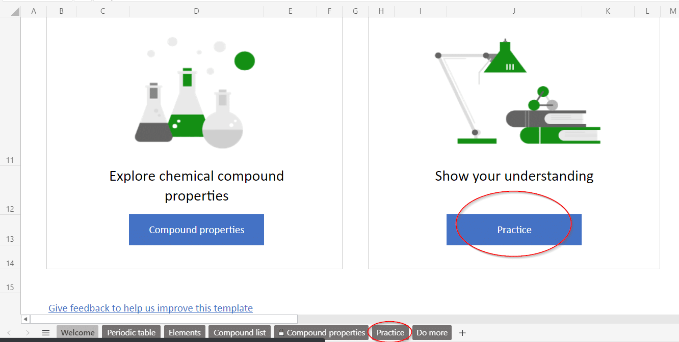 Simply select the Practice box or Practice tab to show your understanding of basic periodic table and answer chemistry questions.