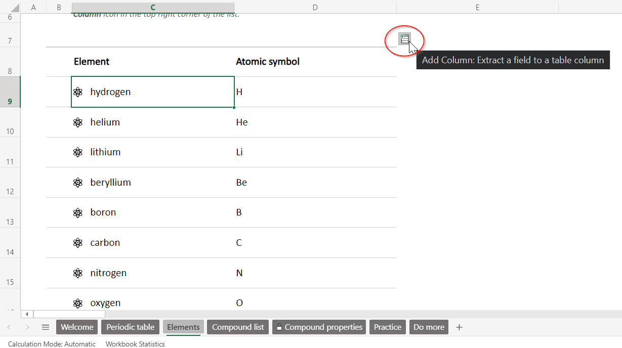 Just use the drop-down arrow to select your chemical compound property, and Excel will autofill the correct data.