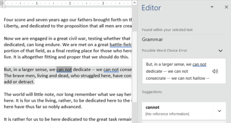 The new spelling, grammar and other suggestion Editor can now be used with selected text, not just the whole Word 365 document.