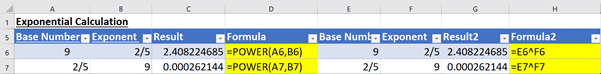 Likewise, if the exponent or Base number is a fraction, both the ^ function and Power() function will calculate within Excel without any trouble.