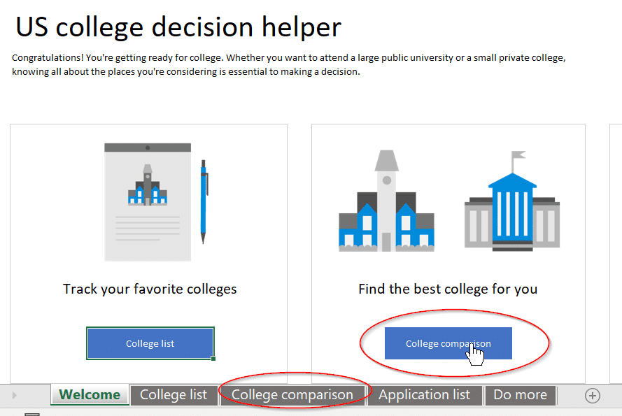 Under Search for online templates type: “US college decision helper” or just “US college” | Start Searching