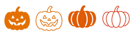 Pumpkin, Carved Pumpkin, Ghost, Cauldron, Web, Skull, Coffin, Gravestone, Haunted House and Witches Hat.