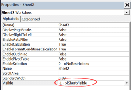 4. In the Properties window, set the Visible property to 2 – xlSheetVeryHidden.