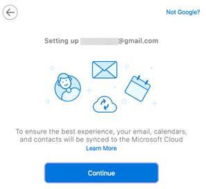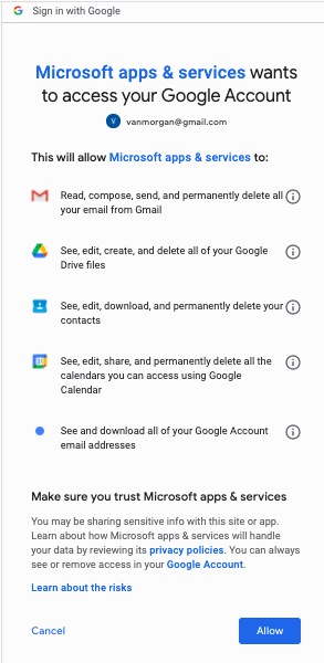 If you click Continue, a browser window will open for a Google login and to give permission for Microsoft to access your Google stored data. As you can see, Microsoft asks for extensive access.