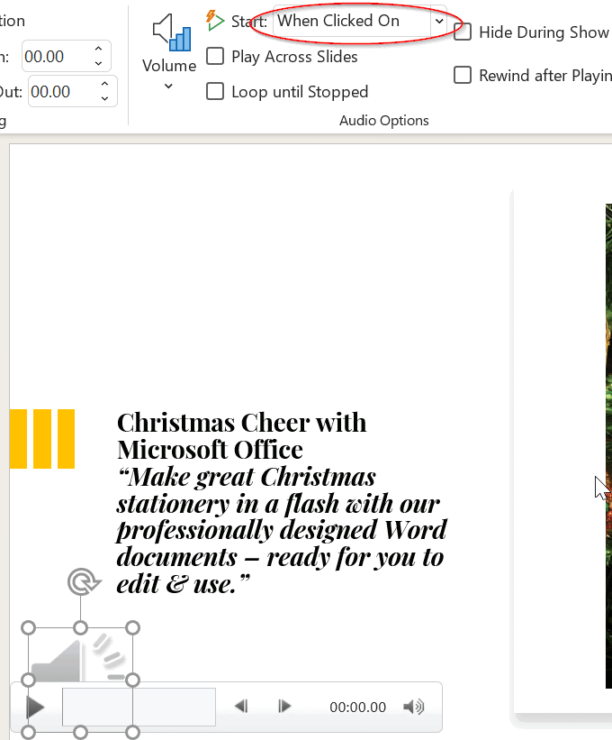 Choose the audio icon then on the Playback pane, choose Start: when clicked on.